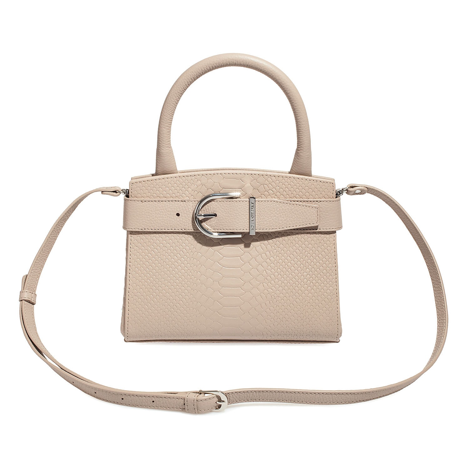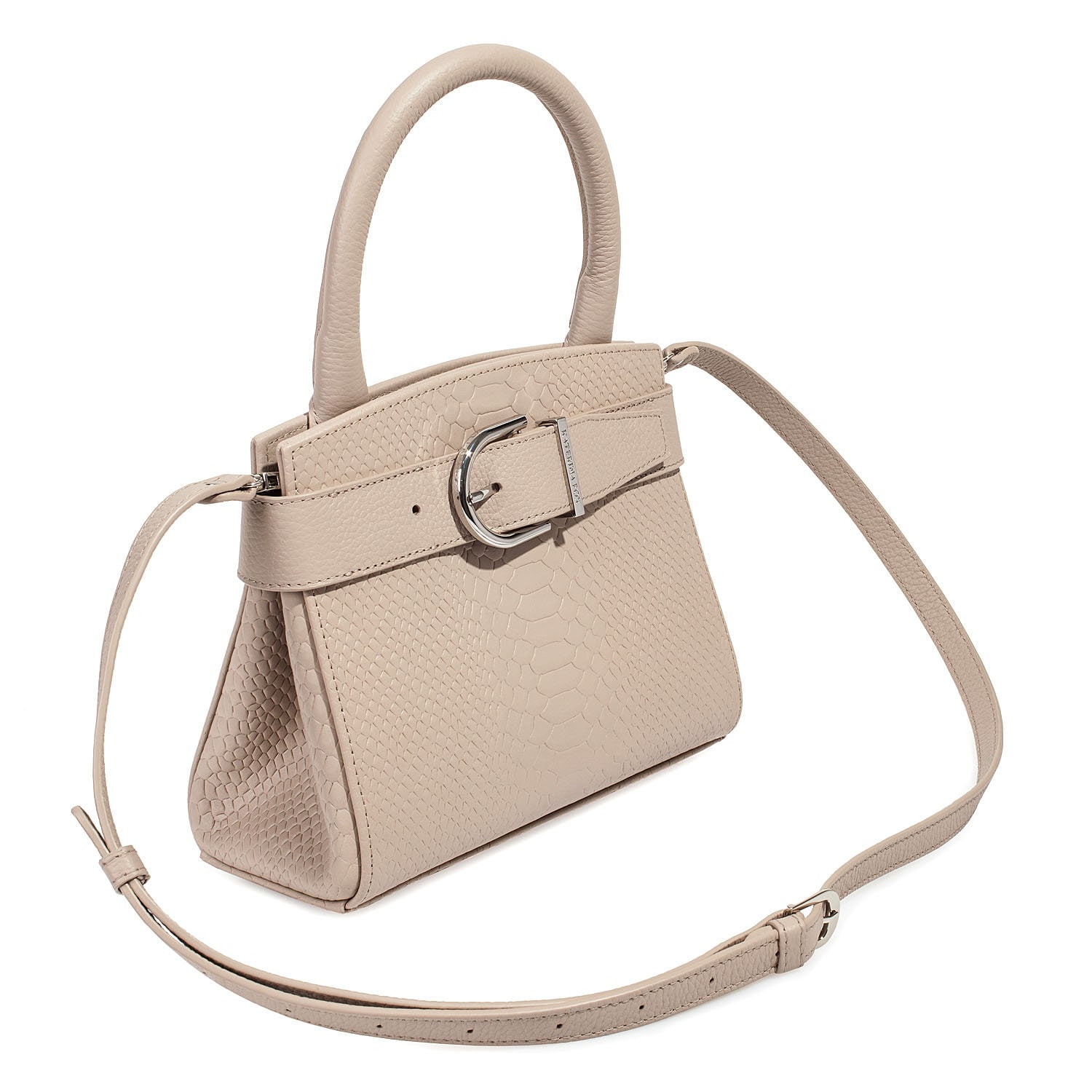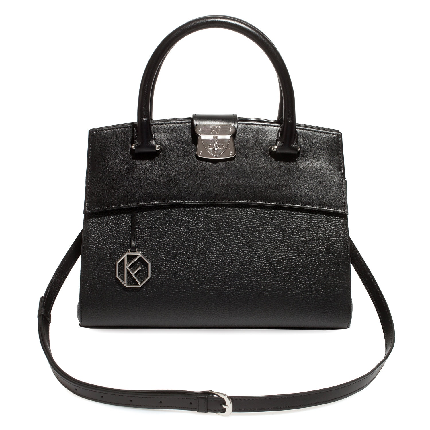 Women's leather bag made of genuine leather, hardware with galvanic coating and microfiber lining. The internal space of a bag is equipped with three compartments, two compartments and two side pockets, one of them with a zipper. It closes with a lock and two magnet buttons. The bottom of the bag is protected with metal legs. There is a long handle that allows you to wear the bag on the shoulder. The kit also includes a storage bag.
